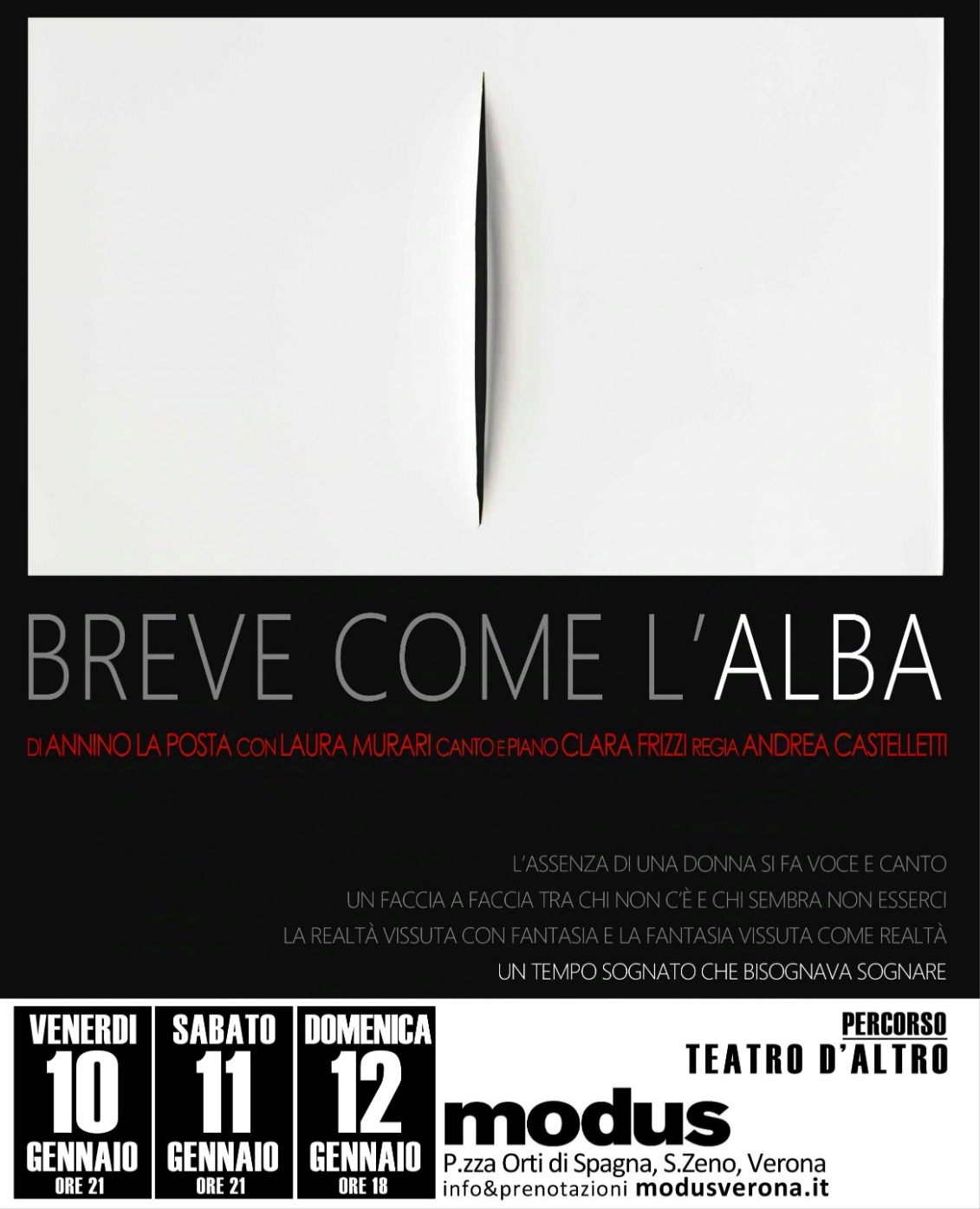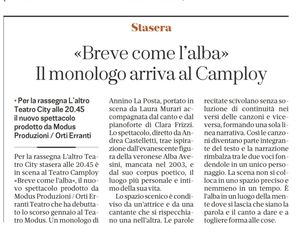 Lo spettacolo che trae spunto dalla figura di una donna che non dovrebbe esserci… ma c’è. Alba Avesini, una donna di grande levatura intellettuale ma che ai più potrà risultare sconosciuta, per la sua predilezione di rimanere appartata, di condurre ritirata la propria azione poetica.